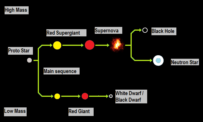 Star sequenceIn the above image, we see how different masses affect a star’s evolution. Lower mass stars like our sun also use up their fuel and expand, though not to the same degree. When their fuel runs out they become white dwarfs and then black dwarfs