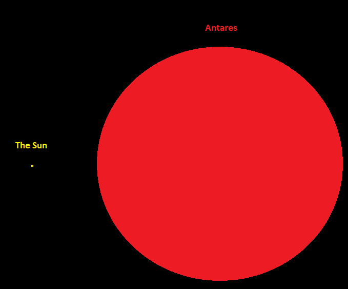 Turns out our sun is not that big…The above picture isn’t an exact scale, but it should give a good idea of just how impossibly gigantic Antares is. For some extra context, if we were to pop Antares in our solar system its circumference would extend far beyond the Earth’s orbit of the sun – going outward as far as Mars. It is certainly well worthy of its scientific classification, a Red Supergiant.