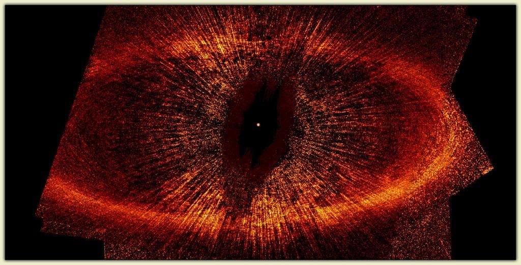 I see you!One does not simply walk into Mordor, not with this watching you at any rate! This isn’t a nebula, but an asteroid belt surround the star Fomalhaut . Much like Tolkiens sinister Dark Lord, this satanic eye bears similar to his description: “being rimmed with fire… watchful and intent, and the black slit of its pupil opened up on a pit, a window into nothing.”